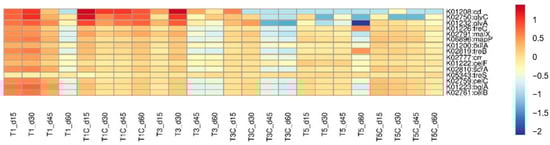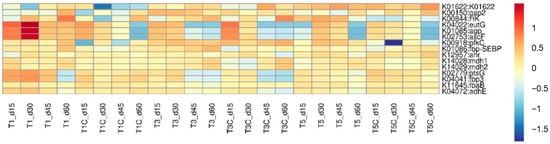 Glycolysis is a metabolic pathway that converts glucose (C6H12O6) into pyruvate (CH3COCOOH). A total of 107 functional enzyme genes were involved in the glycolysis process, with 77 functional enzyme genes related to glycolysis detected in the samples, and their relative abundance heat map was provided. From Figure 10, it could be observed that T1 exhibited a high relative abundance of the β-glucosidase gene (ascF) and 6-phospho-β-glucosidase gene (bglA, celF). β-glucosidase participated in converting extracellular arbutin and salicin into arbutin-6P and salicin-6P, while 6-phospho-β-glucosidase can convert arbutin-6P and salicin-6P into β-D-glucose-6P. The β-glucosidase genes can degrade cellulose in composting []. The higher relative abundance of the β-glucosidase gene in vermicomposting suggested that earthworms enhanced the ability of bacterial communities to degrade cellulose. Furthermore, it was observed that T1 had the ability to convert extracellular arbutin and salicin into β-D-glucose-6P, thereby facilitating subsequent glycolysis processes. In contrast, the relative abundance of the corresponding two enzyme genes in T1C was low, indicating that vermicomposting has the potential to enhance gene function in specific microorganisms and consequently improve the degradation of certain organic matter. The higher relative abundance of glycolysis functional enzyme genes observed in T1 and T1C treatments may be attributed to the increased content of kitchen waste in composting treatment, which contains high levels of starch and fiber substances. These substances are decomposed and utilized by microorganisms to generate a significant number of monosaccharides, thereby promoting glycolysis reactions.