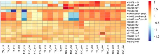 Utilizing a similar approach as the carbon metabolism analysis, a total of 48 functional enzyme genes associated with nitrogen metabolism were identified, and their relative abundance heat map was depicted in Figure 11. Nitrogen metabolism had six primary metabolic pathways, including dissimilatory nitrate reduction, assimilatory nitrate reduction, denitrification, nitrogen fixation, nitrification, and anammox.