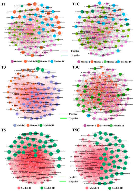 The co-occurrence network serves as a valuable tool that elucidates potential interspecies relationships under specific conditions []. This study constructed a co-occurrence network to explain the interactions among microorganisms based on the relative abundance of bacterial genera. As depicted in Figure 13, each microorganism was partitioned into distinct modules, wherein each module comprised a cluster of diverse genus nodes that exhibited stronger interconnections compared to nodes in other modules. In summary, a negative correlation was observed between the bacterial communities of T1 and T1C, T3 and T3C, as well as T5 and T5C. Notably, the highest negative correlation was found between T1 and T1C, followed by T3 and T3C, with the lowest being T5 and T5C. These findings suggested that microorganisms in T1 and T1C exhibited a strong antagonistic effect, while a stronger synergistic effect was observed between T3 and T3C, as well as T5 and T5C. Furthermore, the negative correlation in the vermicomposting was lower, reflecting earthworms’ facilitation of synergistic interactions among microorganisms in the substrate. As a result, the synergistic interactions among microorganisms contribute to the improved efficacy of treatment.