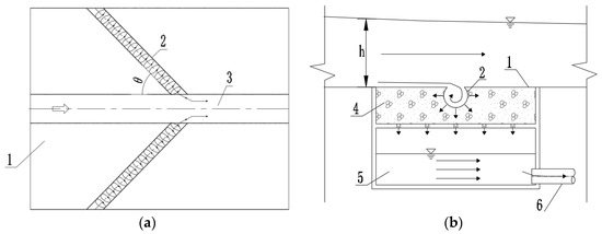 In response to the existing challenges associated with water intake from sandy rivers, the authors suggest an artificial percolation riverbed water intake structure to facilitate a water intake technique that selectively extracts water without capturing sand during the diversion process from a sandy river. The artificial percolation water intake riverbed consists of a bed with percolation vortex tubes on both sides and a sediment transport flume in the center, the arrangement of which is shown in Figure 1 [26].