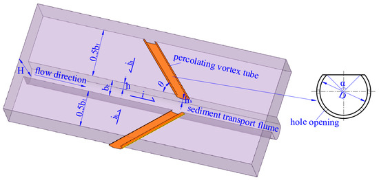The structural parameters of the artificial percolation water intake riverbed include the longitudinal slope of artificial riverbed i, the transverse slope ih, the ratio of the width of the sediment transport flume bz to the width of the beach bt in the artificial riverbed Wb = bz/bt, the ratio of the percolation vortex tube diameter D to hs (difference in elevation between the bottom of the sediment transport flume and the bottom of the vortex tube and sediment transport flume joint) Wg = D/hs, the angle θ between the axis of the percolation vortex tube and the main stream of the artificial riverbed, the opening holes’ ratio Ω of the percolation vortex tube, the opening angle α of the percolation vortex tube, etc. [15,16]. Figure 2 shows a schematic diagram of the parameters.
