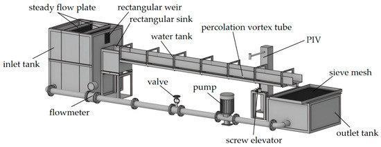 During the test, the inlet and outlet tanks were filled with water and tracer particles were added for data acquisition by the particle image velocimeter. A centrifugal pump was activated to circulate the water through the test setup, and the flow of water through the pipeline was adjusted to the required Reynolds number for the test by controlling the valves and observing the electromagnetic flowmeter readings. The test section was photographed using a Particle Image Velocimetry (PIV) (Dantec Dynamics A/S, Copenhagen, Denmark) after the flow was stabilized. PIV primarily employs a pulsed laser light source to illuminate a designated test section of the water flow that includes tracer particles. Subsequently, a high-speed camera captured particle images at two distinct time points, enabling the calculation of particle displacements using specific algorithms to determine the velocity of the water flow. This method offers numerous advantages, such as non-invasive, full-field, and high-precision measurements. When filming, the outer wall opening of the percolation vortex tube was first closed with waterproof tape, and the section of the test section was filmed, then the outer wall opening of the percolation vortex tube was opened, and then filmed again, while measuring the change in the water level in the catchment tank within a certain period of time, in order to calculate the amount of water seepage. The results were processed by PIV post-processing software (Dynamic Studio 5.0) to obtain the required flow rate values.