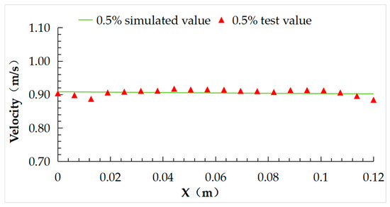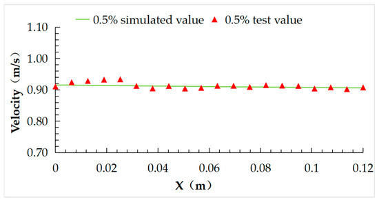 Comparative analyses of simulated and experimental values of the velocity along the flow direction of the measured line between the profile measurement point (0, 0.065, 0.085) and the measurement point (0.120, 0.065, 0.085) in the sediment transport flume were carried out, respectively. Comparison charts are shown in Figure 5 and Figure 6. According to the comparison charts, it can be seen that the simulated values fit well with their corresponding experimental values, and the maximum deviation of the flow rate is not more than 2.2%, which proves the reliability of this numerical simulation; the numerical simulation can be carried out for each design condition and the flow analysis can be carried out accordingly.