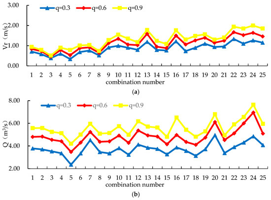 According to the test scheme in Table 2, the single-width flow rates designed in this study are 0.3 m2/s, 0.6 m2/s, and 0.9 m2/s. The following is a sequential study of the effects of different combinations of artificial percolation intake riverbed structural parameters on the average circumferential flow rate of percolation vortex tubes, Vr, and the amount of seepage, Q, for different single-width flow rates, and the results of the study are shown in Figure 7.