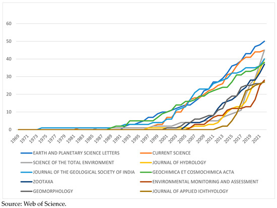 In the analysis of “Sources’ Production over Time”, the “Occurrences” were selected as “Cumulative”, and the number of sources was adjusted to 10. This analysis examines the growth of literature from the top 10 journal sources with the highest number of publications since 1969 (Figure 2). It is observed that before 1989, both the number of publications and the range of journal sources were relatively low. From 1989 to 1997, there was a gradual increase in the number of publications, along with a corresponding increase in the number of journals contributing to the literature. However, after 1997, there was a significant surge in the number of publications in four specific journals: “Earth and Planetary Science Letters”, “Current Science”, “Journal of the Geological Society of India”, and “Geochimica et Cosmochimica Acta”. The four journals have a significantly higher number of literature articles compared to the other six journals. In recent years, the literature on the “Science of the Total Environment” has experienced exponential growth.