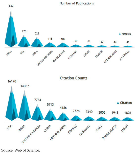 An analysis of the country’s sources of published literature reveals that India has the highest number of publications (Figure 3), accounting for 40.6% of the total publications. The United States closely follows with a contribution of 13.6%, while China accounts for 11.3% of the publications. The United Kingdom represents 5.8% of the literature, while Bangladesh contributes 5.4%. However, in terms of citation counts, the United States has the highest number of citations received among the published literature.