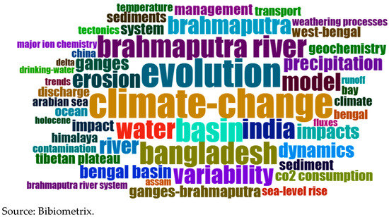 Keywords provide a concise overview of the research topic and its content. The analysis of high-frequency keywords directly reflects the research hotspots in the Brahmaputra basin. We used the “Bibliometric” and “Biblioshiny” packages from the R tool to calculate keywords and create a word cloud map of the top 50 keywords with the highest frequency in this area (Figure 5). The figure shows that the first ten words are as follows: climate change, evolution, basin, Bangladesh, Brahmaputra river, India, water, variability, Brahmaputra, and model.