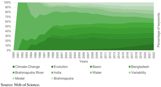 Figure 6 displays the main keywords based on the annual percentage. It can be seen that in the 1990s, the percentage of the keyword “India” in the research related to the Brahmaputra River was significantly higher compared to “Water”, “Bangladesh”, and “Evolution”. Afterwords, various types of research became more detailed, and the percentage of keywords gradually converged in the 1990s. Currently, the annual variations in the proportion of different research directions in the basin are gradually decreasing, and research directions are moving towards stable diversification. Between 1990 and 1993, research on the Brahmaputra basin primarily focused on “India” and “Bangladesh”. During this period, studies on the basin were predominantly conducted within these countries. From 1993 to 1998, the proportion of literature on “Water” and “Evolution” increased. In the context of “Evolution”, the geological, riverine, and coastal evolution of the Himalayas and the Brahmaputra river delta and its surrounding areas is primarily discussed.