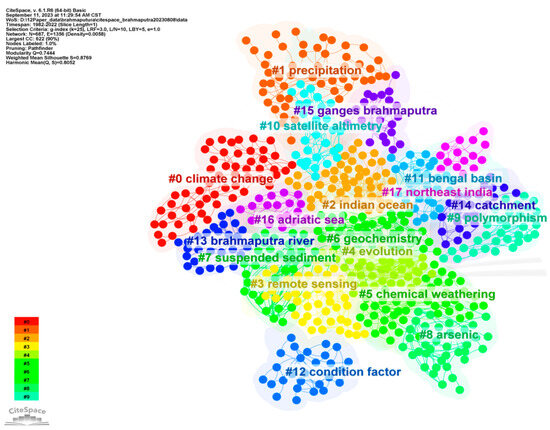 Cluster analysis is a set of statistical analysis techniques that categorize research objects into relatively homogeneous clusters. By categorizing objects into relatively homogeneous clusters, researchers can better understand the intrinsic associations and characteristics in a dataset. In CiteSpace, we selected ‘keyword’ as the network node, ‘pruning’ as ‘Pathfinder’, ‘Pruning sliced networks’, and ‘Pruning the merged network’, while keeping the other options as default. We then ran CiteSpace and selected clusters. Based on the g-index (k = 25), the literature and co-cited links are divided into 17 clusters (Figure 7), which are as follows: Clu0 (Climate change), Clu1 (Precipitation), Clu2 (Indian Ocean), Clu3 (Remote sensing), Clu4 (Evolution), Clu5 (Chemical weathering), Clu6 (Geochemistry), Clu7 (Suspended sediment), Clu8 (Arsenic), Clu9 (Polymorphism), Clu10 (Satellite altimetry), Clu11 (Bengal basin), Clu12 (Condition factor), Clu13 (Brahmaputra river), Clu14 (Catchment), Clu15 (Ganges Brahmaputra), Clu16 (Adriatic Sea), Clu17 (Northeast India).