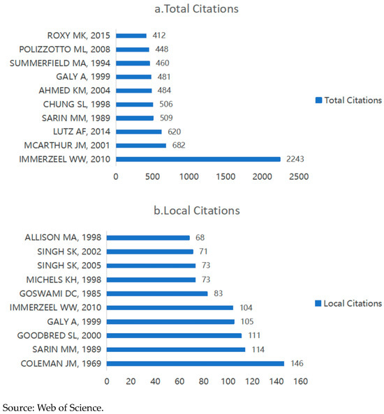 The most frequently referenced literature in GCS relates to climate change in the Brahmaputra basin [13]. The second most cited article is related to arsenic [37]. The most cited literature in LCS is also the earliest SCI literature on watersheds, which was published in the field of geology in Semantic Geology [46]. The second highest citation was published in Geochimica Et Cosmochemica Acta, focusing on the study of chemical weathering and geochemistry [29].