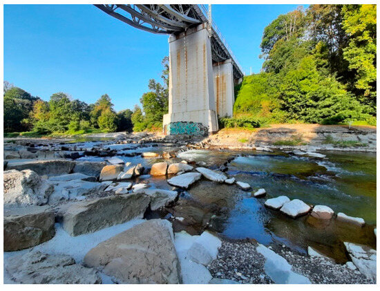 Block ramps also create better biological conditions in the stream through the increased oxygenation of the water for macrobenthos and fish, and harmonise well with the landscape [67,68]. Block ramps can serve as tools for the revitalisation (restoration and stabilisation) of the river system. The restoration of the ecological balance of the watercourse must go hand in hand with a thorough understanding of the problems associated with restoring and repairing the degraded ecosystem. A degraded stream is defined as a stream where biological potential is lacking and the hydrological regime is significantly changed. The revitalisation of the aquatic ecosystem can be understood as technical and biological activities aimed at improving the inappropriate abiotic structure in the technical regulation of the stream. The revitalisation measures focus not only on the aquatic but also on the coastal sphere, with the aim of achieving the optimal biodiversity of flora and fauna and a state of dynamic equilibrium in the stream. Hence, revitalisation involves restoring or improving the quality of the natural functions of the stream, which, as a linear and creative landscape element, is of great importance in the ecosystem. In turn, the concept of renaturalisation can be seen as the restoration of a stream so rigorous that it leads to the return of the original ecosystem in a natural state, with its original biodiversity and the ability to self-regulate [69,70,71,72].