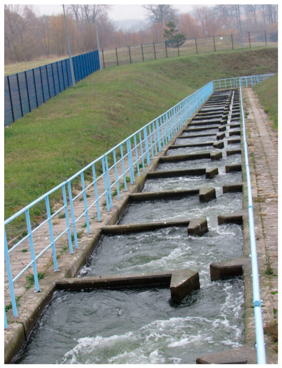 Figure 2 shows a slotted fish pass located at Kozielno Reservoir on the Nysa Kłodzka River. Slotted fish passes are very favourable in terms of water requirements, the amount of area occupied, and their integration with the barrage. However, they can be more easily silted up by flowing plant debris or sediment [39]. A slotted fish pass is characterised by a higher water flow velocity than semi-natural fish passes. This is due to the fact that the individual chambers are connected by narrow slots in which the velocity can reach up to 1.5 m/s. Therefore, some aquatic organisms are unable to use this type of structure to facilitate migration. The analysed fish pass (Figure 2) is located next to the hydropower plant in such a place as to ensure a fish-attracting water stream. Unfortunately, at low flows (so-called droughts), there may be problems with generating an attracting water stream of sufficient power.