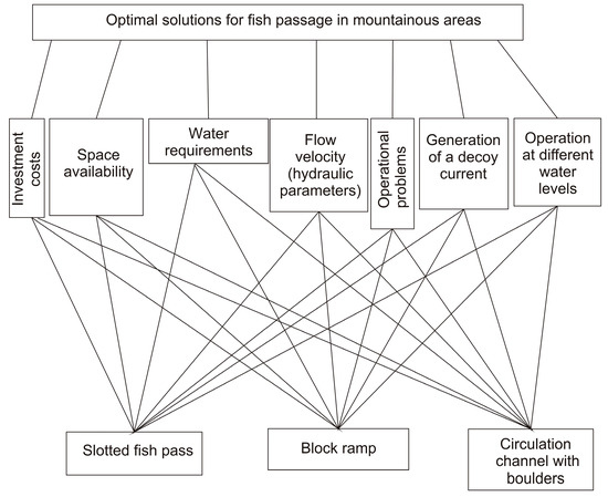 Problem-solving using multi-criteria methods is conducted in several steps. The first is to create a hierarchical structure, i.e., to decompose the analysed problem [34]. The hierarchical tree structure describes the goal, the general factors, and at subsequent levels, increasingly specific factors. The levels of the tree structure in the AHP method can be infinite, but there are always solutions at the last one. The tree structure shows the structure of the discussed issue in a comprehensive and clear way. The applied method for the assessment of the best fish pass solution for mountain rivers should be based on the AHP and Rembrandt methods. In the AHP method, the analysis is carried out according to Saaty’s (1994) 9-point scale. The Rembrandt method is a response to the limitations of using the AHP method related to the rating scale, the method of calculating the value of the variant assessment, and the situation where a new variant is introduced into the ranking. In this method, Saaty’s scale is replaced by a logarithmic scale [44]. The determination of the solution using the Perron–Frobenius eigenvalue method is replaced by the logarithmic least squares method [45].
