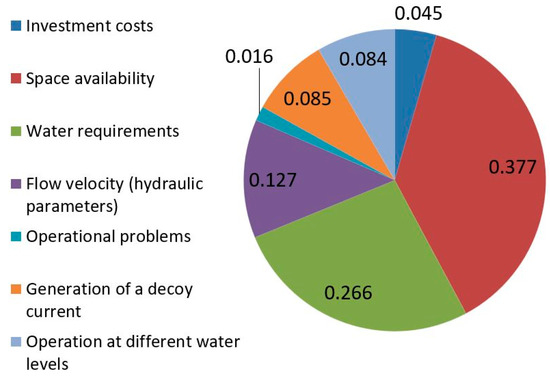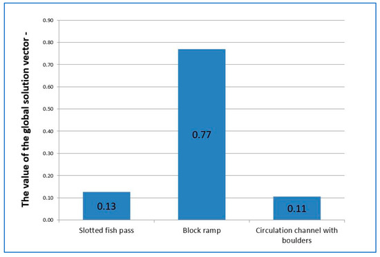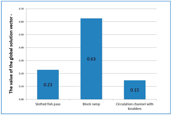 The global vector of the solution, in accordance with the assumptions of the AHP method, indicated that the most favourable option is to build fish passes in the form of a block ramp (0.63). The values of the global vector were at a similar level for the slotted fish pass and circulation channel with boulders and amounted to 0.15 and 0.23, respectively.