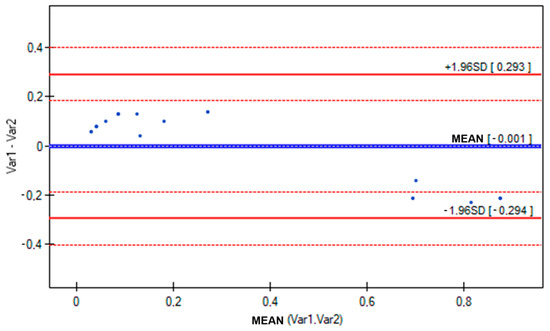 The value of 0.7700 obtained for the block ramp using the AHP method suggests greater variability in this method. Method 1 has a more even and concentrated distribution, with higher results in the lower and middle parts of the range, and its results are less variable. Method 2 shows a wider spread of results, with significantly lower values in the lower part, but higher values in the upper part of the distribution, suggesting greater variability and the presence of extreme values. To compare both methods, a Bland–Altman plot was used (Figure 9).