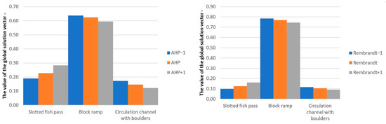 At level III of the hierarchical tree, the largest difference was recorded for the slotted fish pass and was 0.10. For the remaining solutions, i.e., the block ramps and the circulation channel with boulders, the difference between the values of the global vector calculated using the Rembrandt and AHP methods were 0.05 and 0.04, respectively. On the basis of the analyses carried out, it can be concluded that the greatest differences were observed between the results of the individual methods at level III of the hierarchical tree. However, they had no significance when selecting the type of fish pass solution.