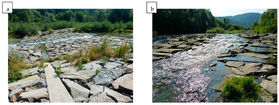 As the analyses showed, the best solution to ensure the effective, two-way migration of fish is the use of block ramps (Figure 11a). These are structures that meet technical and engineering requirements, but also successfully perform ecological tasks [40,57]. These structures are often arranged in a way that causes the stream to concentrate in the central part of the structure (Figure 11b) [58]. Moreover, they should have an appropriate slope so as not to interfere with the migration of aquatic fauna. At the same time, they serve as bed stabilisation below, e.g., bridges or culverts, they serve as elements of protection against channel erosion, they reduce the slope of the watercourse, and they lead to the restoration of channel beds [59,60,61]. These structures can successfully replace traditional vertical concrete barrages [62].