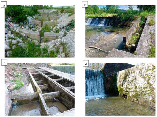Examples of a lack of functionality in fish passes. (a) the semi-natural fish pass without water (b,c) pool/chamber fish passes in critical technical condition (d) no attractant current in the outlet of the fish pass.