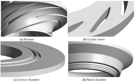 ANSYS mesh tools are used to mesh the fluid domain using tetrahedral and hexahedral elements, which takes both computational cost and simulation accuracy into consideration. To simulate wall behavior more accurately, the inflation method is adapted to mesh stay vanes, guide vanes, and runner blades into boundary layers. The mesh details of the pump-turbine unit are shown in Figure 2, and the element numbers of each flow domain can be found in Table 2.