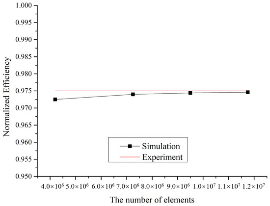 Four sets of mesh models are constructed based on different mesh sizes of the runner, stay vanes, guide vanes, and draft tube for mesh independence analysis. Efficiency is used as a parameter to compare the calculation accuracy with model tests. The results shown in Figure 3 indicate that the mesh with over 7.25 × elements match well with the results of model tests and are suitable for use in calculations. Table 3 shows the basic parameters for comparison with model experiments.
