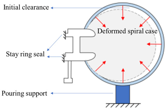 The contact state between PSSC and concrete is closely related to the relative magnitude of preloading pressure and hydraulic pressure. The hydraulic imbalance under pump operating conditions leads to horizontal deflection of the structure, and the force inside the PSSC is biased towards the outside, resulting in less expansion on the stay ringside and difficulty in forming contacts. Higher preloading pressure can lead to an increase in initial preloading clearance, resulting in a decrease in contact area.