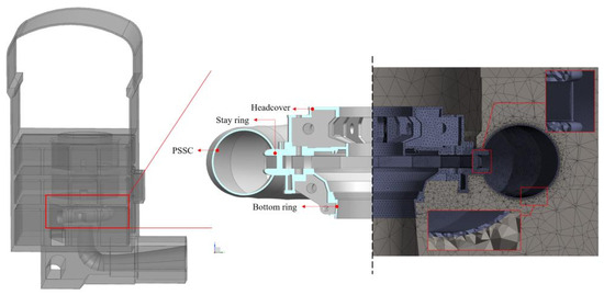The 3D structural model consists of the deformed PSSC, stay ring, and surrounding concrete. The structural components of PSSC and the stay ring are made of structural steel. The material parameters are shown in Table 4. The structural model is mainly meshed by tetrahedral mesh elements, and the element type is SOLID178. The nonlinear contact surface between PSSC and concrete adopts CONTA174 and TARGE170 elements. The mesh details are shown in Figure 5, with 2.01 × nodes and 1.29 × elements. The mesh of the rounded connection between stay vanes and stay ring is refined to accurately calculate stress concentration.