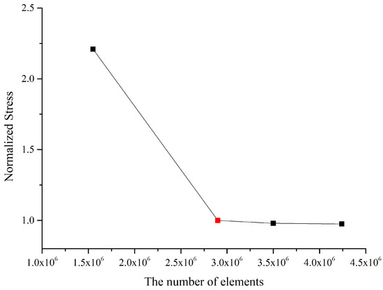 Four sets of mesh with different sizes of elements are checked with in stress concentration areas. The comparison results are shown in Figure 6. The mesh with 2.96 × elements (represented by red dot) is suitable for structural domain calculations in terms of both computational accuracy and memory usage.