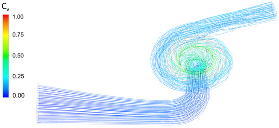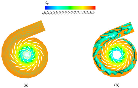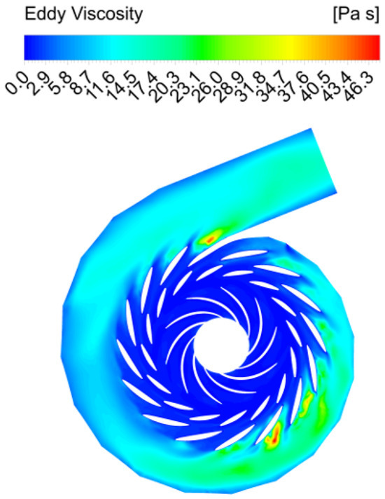 The Q criterion is used to identify the vortex zone of the spiral case, and the Q value is set to 1 × . As shown in Figure 8b, the disorder of the streamline inside the spiral case caused significant vortex motion. Figure 9 shows the eddy viscosity distribution of the unit, which also proves the uneven flow inside the spiral case. Two main vortex zones can be found in the area between the spiral case and the stay vanes, leading to differences in the time-frequency distribution of pressure fluctuations, resulting in different structural excitations.