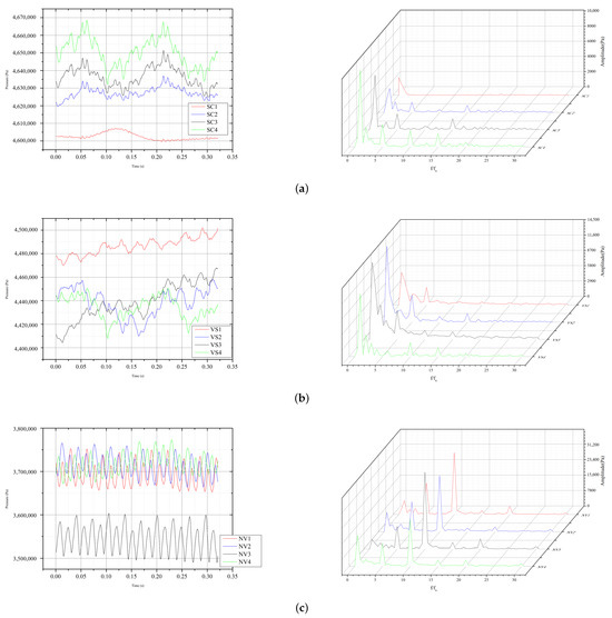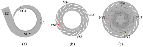 Figure 10 shows the distribution of monitoring points in the flow domain, where SC1–4 is located at the spiral case, VS1–4 is located at the center of the stay vanes, and NV1–4 is located at the vaneless space. Monitoring points are evenly distributed in the circumferential direction.