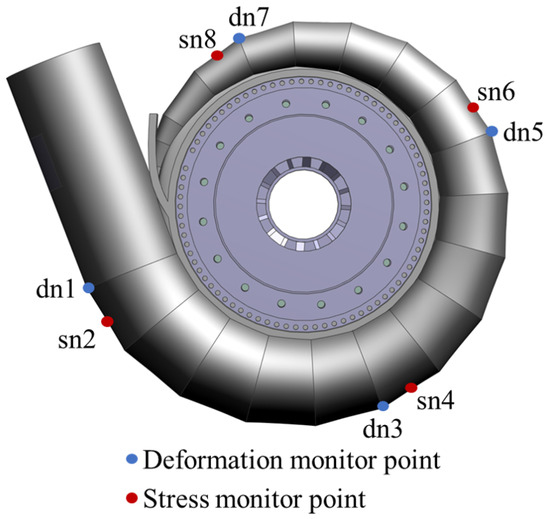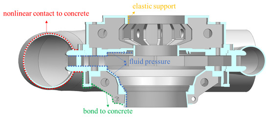 Using the fluid–structure coupling model, the pressure load simulated by CFD is mapped onto the structural domain to accurately simulate the spatial distribution and dynamic changes in internal fluid pressure boundary conditions. Gravity, elastic support of the bearing, bond, and nonlinear contact to concrete are applied to the surface of the PSSC. The stresses and deformations of the unit and concrete are calculated. The diagram of boundary conditions for the PSSC is as Figure 12, and the distribution of monitoring points in the structural domain is shown in Figure 13.