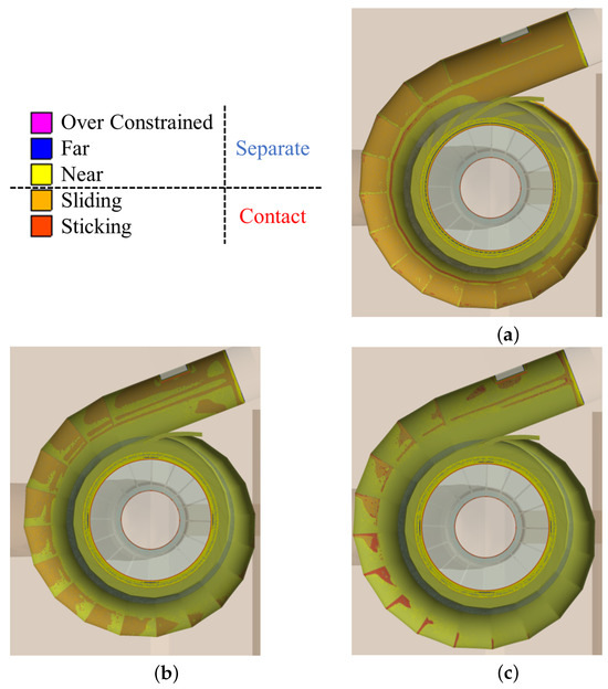 Contact status between the PSSC and concrete under different preloading pressure. (a) 3.2 MPa; (b) 4.564 MPa; (c) 6.52 MPa.