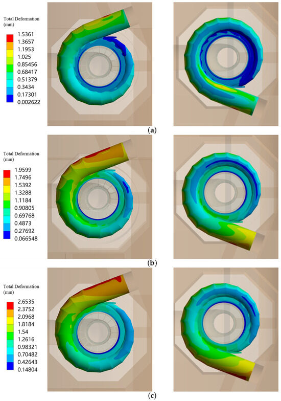 The total deformation distribution of the PSSC under different preloading pressure. (a) 3.2 MPa; (b) 4.564 MPa; (c) 6.52 MPa.
