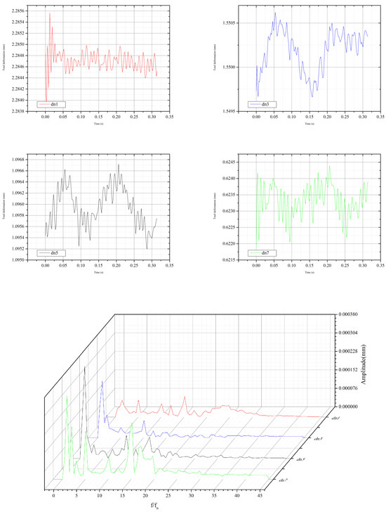 The time history and frequency spectra of dynamic deformation of the PSSC are shown in Figure 16. The change in preloading pressure has little effect on the dominant frequencies of dynamic deformation. The results under different preloading pressures are similar. Taking the result at 6.52 MPa as an example, the trends of these four monitoring points follow the same pattern, with a dominant frequency of . According to the analysis of in Figure 11, it is speculated that the vortex motion inside the spiral case is the dominant factor in the deformation distribution. Even though the impact of RSI inside the spiral case is already minimal, the monitoring points still show a significant component, indicating that RSI also has a certain influence on the vibration of the spiral case structure.