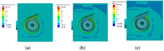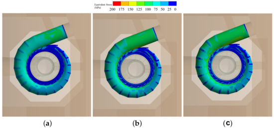 The stress distribution of the unit stationary components. (a) 3.2 MPa; (b) 4.564 MPa; (c) 6.52 MPa.