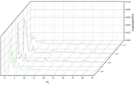 Similar to deformation, the stress results under different preloading pressures indicate that preloading pressure has little effect on the dominant frequency of stress changes in PSSC but has a significant impact on amplitude. As shown in Figure 18, the main frequency of dynamic stress in PSSC is the frequency of vortex motion inside the spiral case (), and the amplitude variation pattern at each monitoring point is also similar to deformation. The static stress value is relatively high near sn2 (about 95 MPa), while the dynamic stress exhibits larger amplitudes at other monitor points. Although these values are within the safe range, they also indicate that the strength failure and fatigue failure positions of the structure are not consistent and should be taken seriously in the design stage.