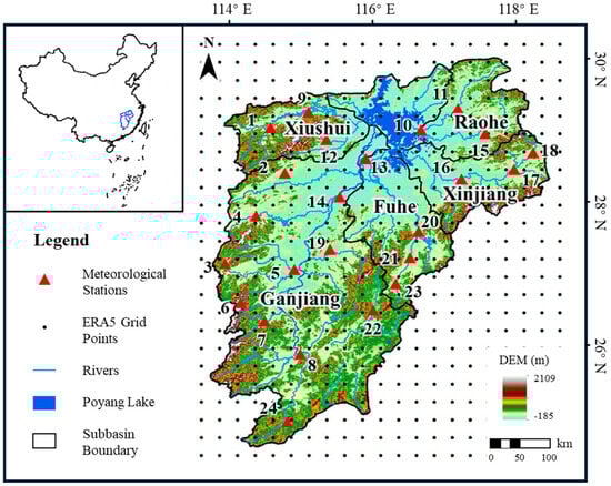Yan, X.; Zhang, M.; Yin, F.; You, J.; Chen, Y.; Gao, L. Multi-Scale Evaluation of ERA5 Air Temperature and Precipitation Data over the Poyang Lake Basin of China. Water 2024, 16, 3123. https://doi.org/10.3390/w16213123