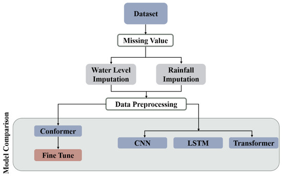 The research process is illustrated in Figure 1. It begins with an examination of the data missing from datasets collected in the Lanyang River Basin. Both rainfall and water level data are subjected to imputation to increase the completeness of the data; this is followed by data slicing and normalization during the preprocessing stage. The preprocessed data are then used to train the proposed Conformer model for water level prediction, with ablation studies conducted to assess the impacts of the different structures contained within the Conformer. Finally, we perform a comparative analysis of the performance achieved by the Conformer and established models such as a CNN, LSTM, and a transformer in terms of water level prediction. This analysis aims to evaluate the applicability of the Conformer architecture to hydrological forecasting, with the expectation of improving the accuracy and reliability of hydrological predictions; in turn, this could enhance flood forecasting and management capabilities.