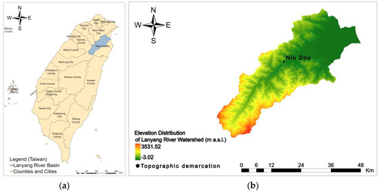 (a) Geographical location and (b) elevation distribution maps of the Lanyang River Basin.