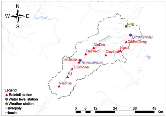 The study area is the Lanyang River Basin, which is located in northeastern Taiwan, as shown in Figure 2. The topography within the basin can generally be divided by the black dots labeled “Niu Dou”, which represent the main topographic boundaries of the basin. Upstream of this point, the landscape features steep valley rivers with varying channel widths and fast currents, while downstream the terrain transitions to gentler plains. The Lanyang River is the main river in Yilan County, with a maximum elevation of 3536.6 m. The main stream is approximately 73 km long, with a watershed area of 978 km2. Of this, 652 km2 are mountainous, and 326 km2 are flat terrain. The average slope of the main stream is 1/55. The region experiences a subtropical monsoon climate, with temperature and rainfall characteristics varying across different seasons. The annual average temperature is 22.8 °C, with the highest average temperature of 28.9 °C in July and the lowest average temperature of 16.6 °C in January.