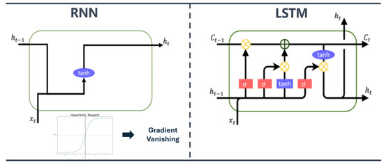 Hochreiter and Schmidhuber (1997) [33] proposed LSTM based on an RNN and added cell states to improve its memory function, as shown in Figure 5. They increased the long-term dependence of the model and successfully solved the gradient vanishing and gradient explosion problems faced by RNNs. LSTM is composed of three main stages: an input gate, an output gate, and a forgetting gate. Four kinds of information are obtained by splicing the current input and the previous transfer state for training. Among them, are normalized to [0, 1] by the sigmoid function, whereas is normalized to [−1, 1] by the tanh activation function to assist with the memory update and storage tasks.