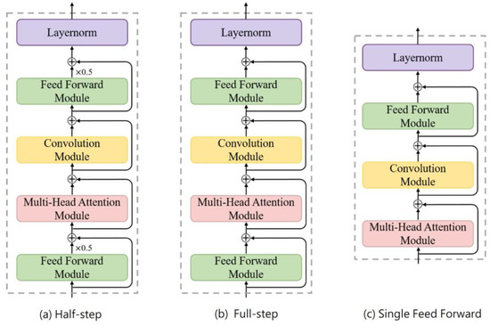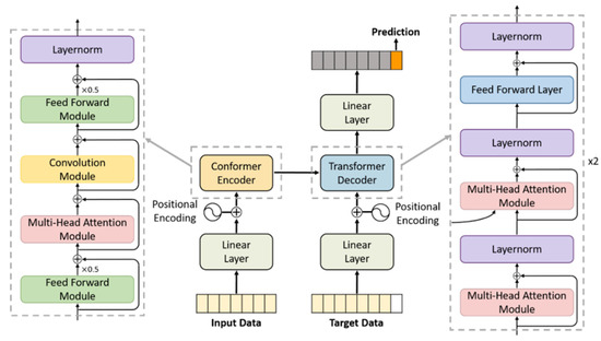A transformer, which uses self-attention mechanisms, can process an input sequence in its entirety rather than analyzing individual elements in isolation. Its ability to handle long-range data dependencies and scalability issues makes it a robust tool for completing numerous sequence-to-sequence prediction tasks. The Conformer model incorporates convolutional layers into the transformer architecture [29]. This addition allows the Conformer to effectively capture both the local and global dependencies contained in the given data, leading to a more detailed representation of the input features. The core of the Conformer model, known as the Conformer block, consists of multiple submodules.