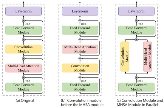 Second, we examined the effect of the order of the convolution operations and self-attention operations by adjusting the position of the convolution module within the encoder. The structures of the tested model variants are illustrated in Figure 11, which compares (a) the placement of the original convolution module after the multihead self-attention (MHSA) module, (b) the placement of the convolution module before the MHSA module, and (c) running both operations in parallel with respect to the resulting water level prediction performance. Table 14 shows the results of the experiments that altered the sequence of the convolution module and the MHSA module. The outcomes suggest that processing the input features through self-attention computations before implementing convolution operations may increase the efficiency of feature extraction.