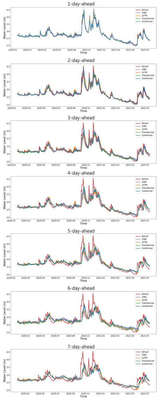 The purpose of this study is to explore the feasibility of applying the Conformer model, which has achieved exceptional performance in the field of speech recognition, to water level prediction. This section analyzes and discusses the performance attained by the Conformer model in daily water level prediction tasks, with three commonly used deep learning models—a CNN, LSTM, and a transformer—as comparison approaches.
