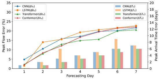 Since relying solely on the NSE and R2 metrics does not provide a comprehensive evaluation of the performance of a model in terms of simulating peak water levels, this study also employs the peak water level error percentage (ΔHp) and peak water level arrival time error (ΔTp) to assess the accuracy of the model predictions. The performance of each model with respect to ΔHp and ΔTp is shown in Figure 14. In terms of ΔTp, the transformer and Conformer models exhibit smaller errors, whereas the LSTM model has the largest error. This is likely because the memory units of LSTM retain too much long-term memory, which prevents the model from accurately reflecting the most recent trends, leading to high latency in its predictions. With respect to ΔHp, the transformer and Conformer models perform better in the first 3 days of the forecasting period; however, the errors induced by both models tend to increase as the forecasting horizon extends, indicating that there is still room for improvement in the ability of these models to capture long-term peak water level characteristics.