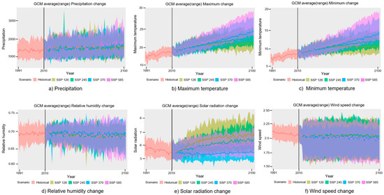 Annual variability of the Korean Peninsula climate under the shared socioeconomic pathway (SSP) scenarios. (a) Precipitation, (b) Maximum temperature, (c) Minimum temperature, (d) Relative humidity change, (e) Solar radiation change, (f) Wind speed change.