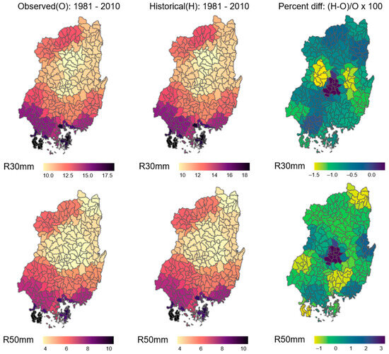 Reproducibility evaluation based on the number of rainfall days R30 mm and R50 mm (R30 mm: number of days of rainfall greater than 30 mm, R50 mm: number of days of rainfall greater than 50 mm).