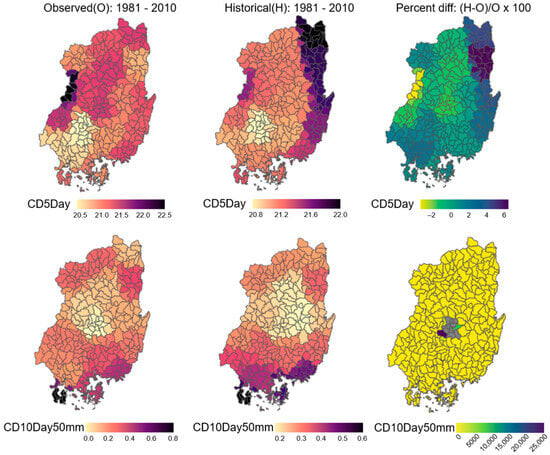 We evaluated the reproducibility of comparing observations and multi-model ensemble (MME)-based results from multiple GCMs for the same period. This assessment was based on climate indices closely associated with the outflow of nonpoint sources: the number of days of rainfall greater than 30 mm (R30 mm), the number of days of rainfall greater than 40 mm (R40 mm), the number of days of rainfall greater than 50 mm (R50 mm), the number of days without rainfall for more than 5 d (CD5Day), and the number of days of rainfall greater than 50 mm after no rainfall for more than 10 d (CD10Day50 mm) (Figure 3 and Figure 4).
