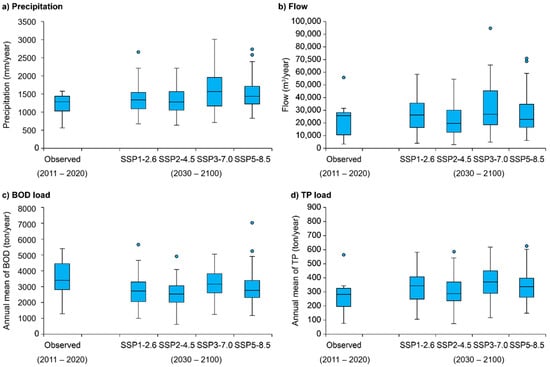 Specifically, while considering the application of the SSP3-7.0 scenario, the mean runoff was found to increase by 33% compared with the observed measurement. Furthermore, the load variability was projected to increase by more than a maximum of 70%. The arithmetic mean value of BOD loads was projected to decrease compared with the loads that could be discharged under current meteorological conditions. However, when comparing the variability of loads per climate change scenario with the present, high outliers were found, indicating the greater variability of loads. In the SSP1-2.6 and SSP2-4.5 scenarios, the average runoff load was projected to decrease by 21.2% and 27.5%, respectively, compared with the observed measurements. In the SSP3-7.0 scenario, the mean runoff load was projected to decrease by 11.3%, and in the SSP5-8.5 scenario, it was projected to decrease by 16.8%. Among the four scenarios, the SSP5-8.5 scenario exhibited the highest outlier (7026 t/year) and was projected to have the largest fluctuation range (1175–7026 t/year).