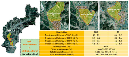 The pollution load treatment efficiency was examined based on the load abatement efficiency under the SSP5-8.5 scenario; when simultaneously applying infiltration trench and grassed swale to 20% of the agricultural field area, it was analyzed to record the highest abatement efficiency (BOD 7.5–13.4%, TP 5.5–7.8%). Regarding the facility, the infiltration trench was analyzed and exhibited a higher abatement efficiency than the grassed swale, but if installation and annual maintenance costs were considered, the analysis showed that it was more efficient to simultaneously install both facilities in an appropriate location than a sole installation of the infiltration trench. Comparing costs and efficiency per scenario with abatement facilities installed showed that the simultaneous installation of both a grassed swale and infiltration trench in Reach 3 was the most effective method (Figure 8).