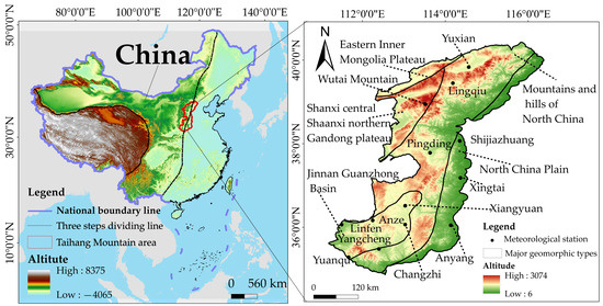 The Taihang Mountains (34°34′–40°43′ N; 110°14′–116°34′ E) have an elevation range of 6 to 3074 m, with the highest peak situated in Wutai County, Shanxi Province. Acting as the natural boundary between China’s second and third topographic steps, the mountains are flanked by the North China Plain to the east and the Loess Plateau to the west. The region encompasses diverse and complex terrain, including plains, mountains, hills, basins, and plateaus (Figure 1). The area is characterized by well-developed river systems, with numerous rivers (Figure 1) belonging to either the Haihe or Yellow River systems [16]. Notable rivers such as the Yongding, Juma, Tang, Dasha, Hutuo, Mian, Qingzhang, Zhuozhang, Anyang, and Qi Rivers are part of the Haihe River system, while the Dan and Qin Rivers belong to the Yellow River system.